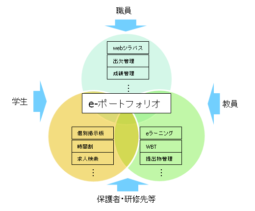 - e-ポートフォリオを中核とし、学生の視点に立った利便性はもちろんのこと、教職員からの管理も簡便な教育支援の基幹システムとなります。