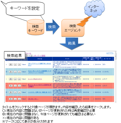 - 検索キーワードを指定し、定期的にそのキーワードでエージェントによるインターネット検索を行います。